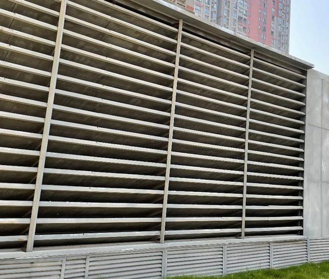 3、進氣消聲。空調(diào)外機進氣也是降噪的重點之一。由于空調(diào)機組設備較大,排氣量與進氣量都是非常巨大的,但是空調(diào)設備的壓縮機產(chǎn)生的噪聲值也是非常的高,既要保證降噪效果又要保證進氣,所以使用進氣斜插式消聲百葉和進氣企口。